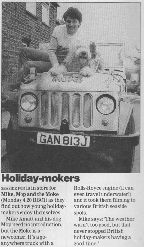 I wouldn’t let the BBC take Smiff out of the house or neighbourhood. Plus, I came up with the idea called “Mike and Mop – Island Hop”. I wanted to go to The Isle of Man, Isle of Dogs, Wight, Guernsey etc. With a motorbike and sidecar. Mop didn’t like the sidecar so we changed it to the Austin Champ. We called it a moke, not because of the mini- moke but because a moke is a Spanish word for a donkey or goat that goes almost anywhere I think.